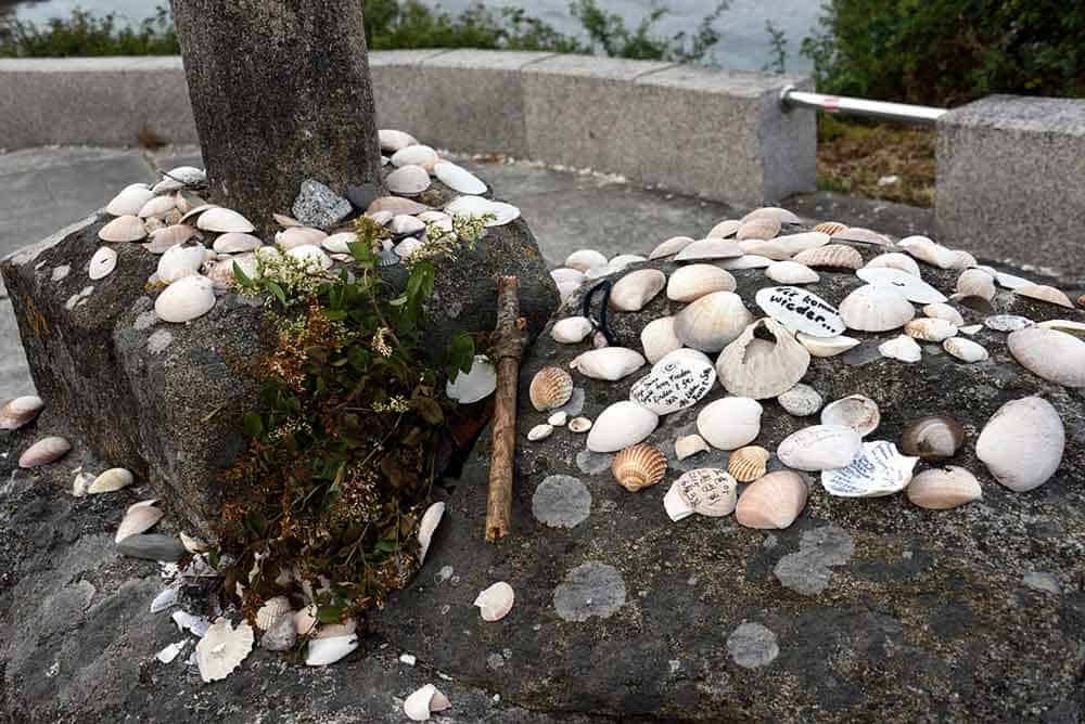 Im Mittelalter konnte man an den Pilgerzielen Pilgerabzeichen erwerben. Der Pilger sollte so auf dem Heimweg geschützt werden. Dieses Pilgerabzeichen ist die Jakobsmuschel. Ursprünglich diente sie auch als Nachweis, dass der Pilger die Reise tatsächlich absolviert hatte. Am Kap Finisterre finden wir am Strand eine Wegkreuzung, an der die Muscheln als Omen hinterlassen werden.